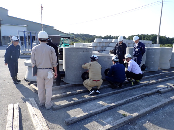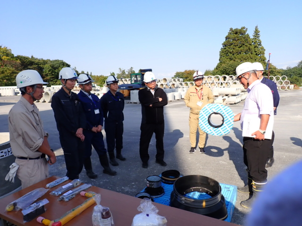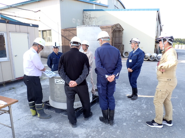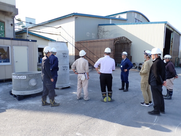 2025年10月15日 十和田市上下水道部下水道課より6名の方が、工場見学にいらっしゃいました。プレホールやその他の製品についてのご紹介・ご説明、スラモル(流動化埋戻し材)打設のデモンストレーションを行いました。