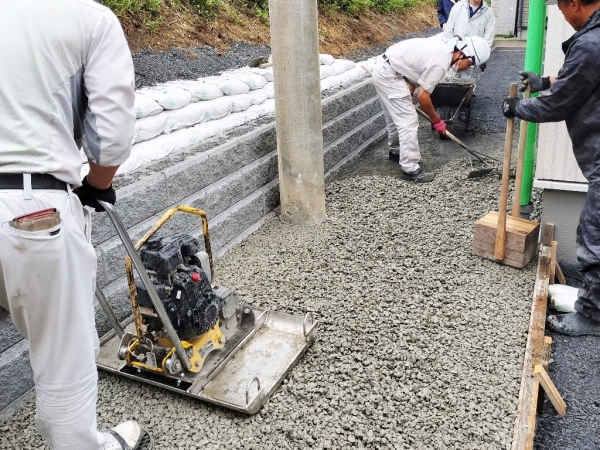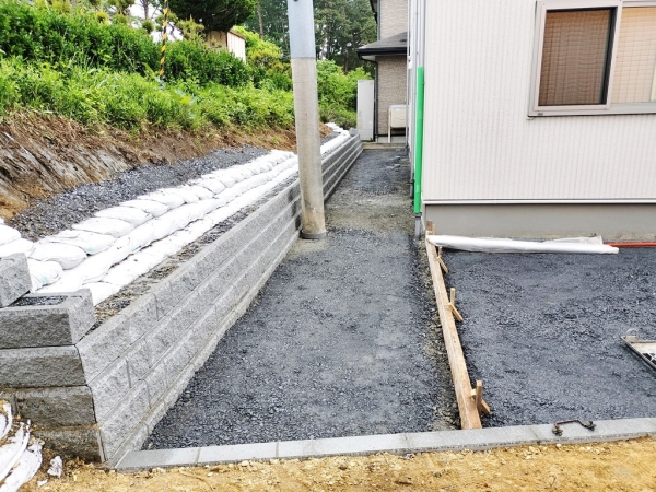某様邸 犬走り 住宅周りの犬走りをオコシコンで舗装。雑草対策にもなる透水性コンクリートにより、美観を保ちます。施工業者 (株)ZIP 様■ 打設前■ レーキで敷き均し ⇒ 中はプレート・縁はタンパで転圧■ 打設完了